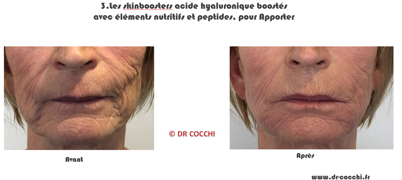 Les skinboosters se composent d’acides hyaluroniques faiblement réticulés au fort pouvoir hydratant des couches superficielles et moyennes du derme type Profilho®. Ils peuvent aussi être boostés avec des micronutriments type vitamines, minéraux, oligoéléments, acides aminés essentiels et parfois peptides de signalisation cellulaire adaptés à votre problématique de peau, le Dr Cocchi réalisant une préparation sur mesure.